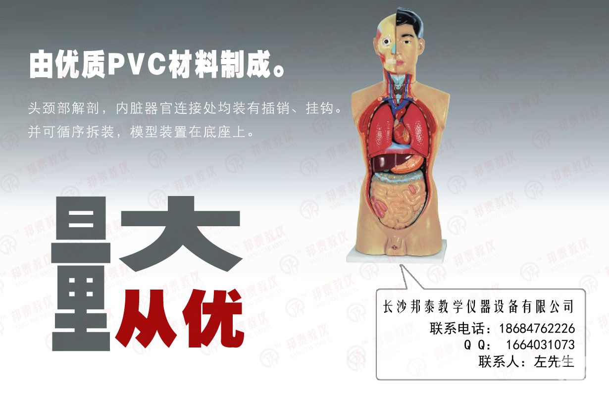 由優(yōu)質(zhì)PVC材料制成。頭頸部解剖,內(nèi)臟器官連接處均裝有插銷(xiāo)、掛鉤。并可循序拆裝,模型裝置在底座上。