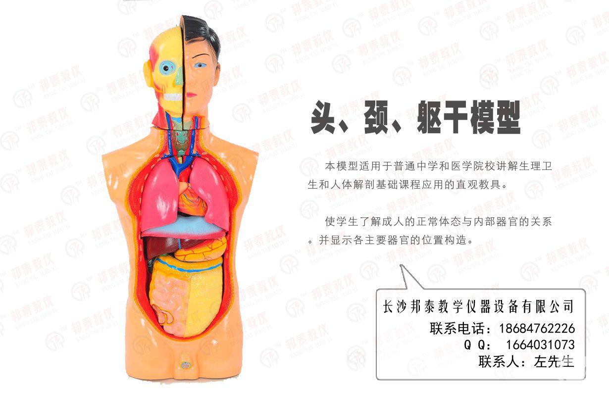 本模型主要顯示人體內(nèi)部器官的位置及頭部解剖的形態(tài)和構(gòu)造。并突出表現(xiàn)呼吸、消化、泌尿等三個(gè)系統(tǒng)。