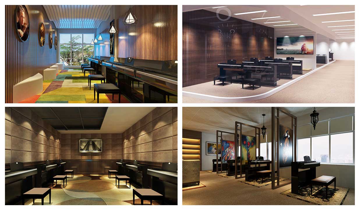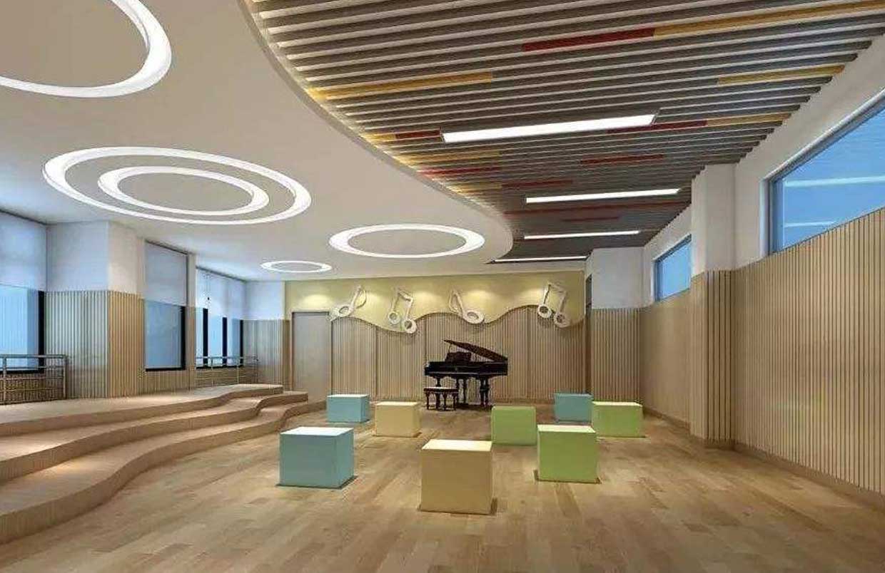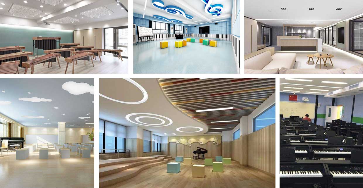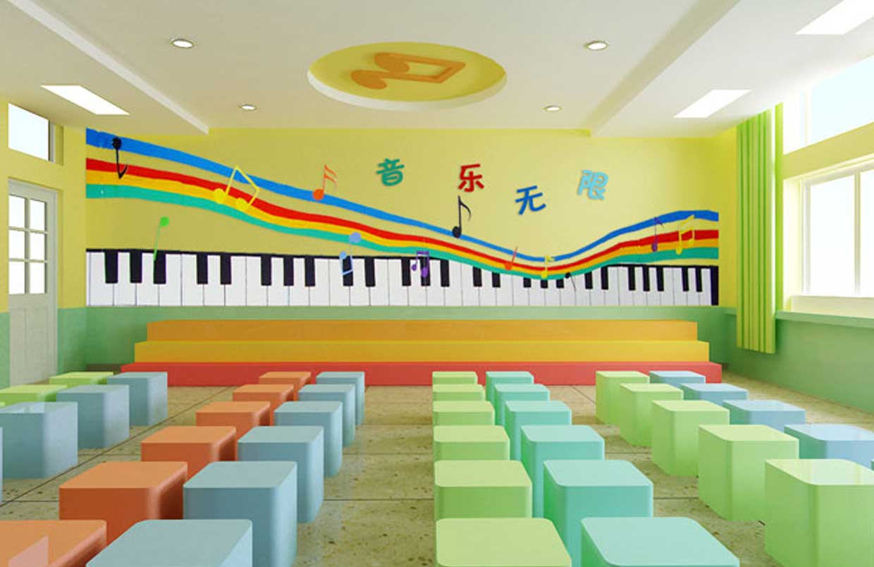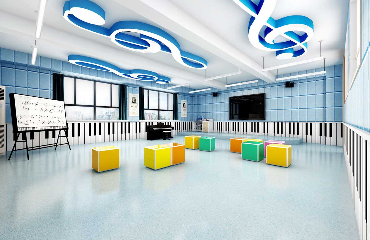 對于教師的教學需要配備有譜架、教師桌椅等,而學生應有六面體凳和普通帶小桌板的椅子等。教室四周墻壁可懸掛音樂家掛圖、樂器掛圖、識譜知識掛圖、音樂故事簡介等,可以幫助學生了解關(guān)于音樂的相關(guān)知識。此外還可以用各種各樣彩色的音符點綴教室,色彩偏亮色,活躍而灑脫??扇〗淌乙贿呉粔K區(qū)域可以設置儲物柜,用于儲藏各種樂器。