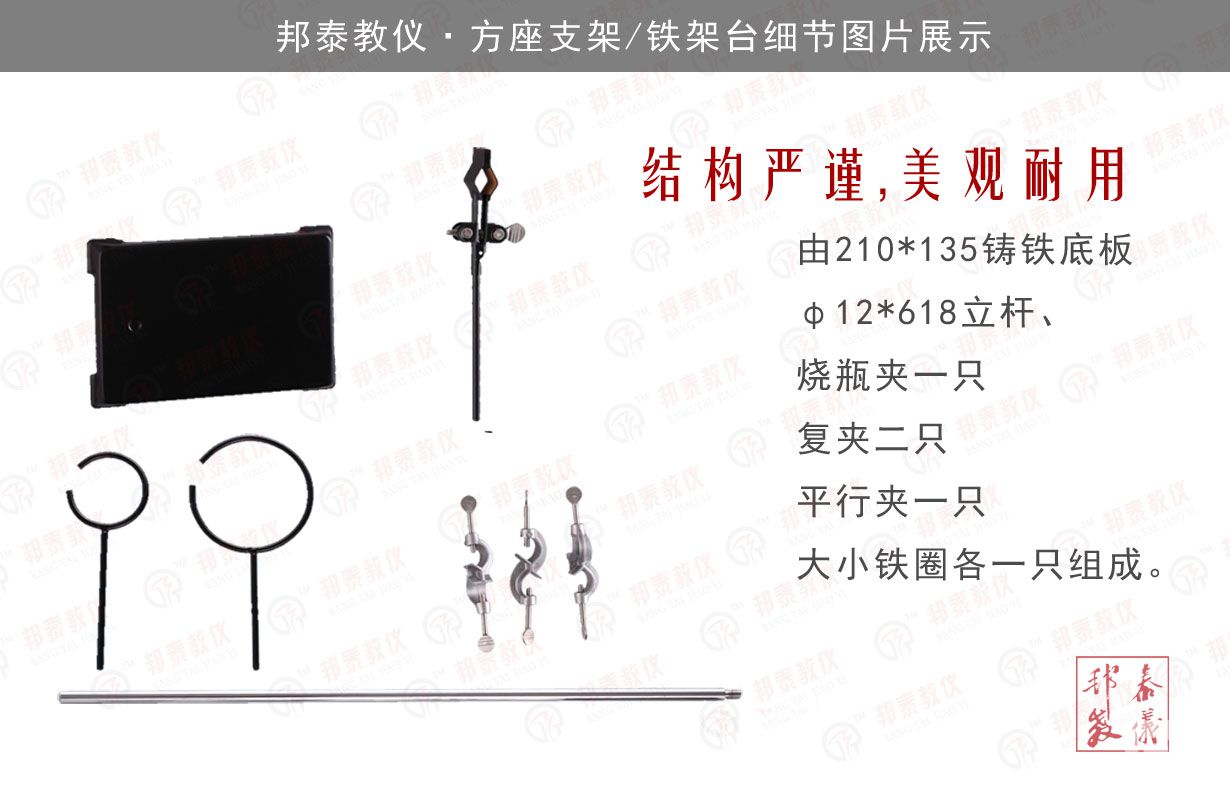 1、 方座支架,首先將底板方在平衡的桌上,將立柱裝在底板的前面孔上,根據(jù)實(shí)驗(yàn)要求,調(diào)節(jié)鐵環(huán)、鐵夾于適當(dāng)位置進(jìn)行實(shí)驗(yàn)。